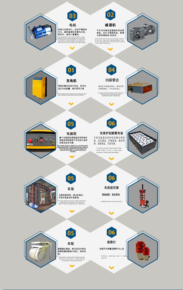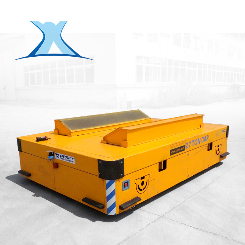 12噸無軌運輸平板車是一種電動有軌廠內運輸車輛。又稱臺車、過跨車、地爬車。它具有結 構簡單、使用方便、容易維護、承載能力大、污染少等優點,而作為短距離運輸工具得到廣 泛應用,也可作為車間內部配合吊車運輸重物過跨之用。