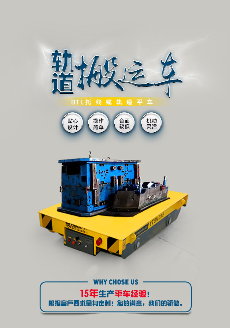產品介紹:1.安全載重系數高 平車采用箱梁式結構,車輪采用的車加工,熱處理,平車的安全系數可以達到1.5 2.自動化程度高 平車可以增加plc,實現自動化對接,無人操作車間 3.短途運行應用范圍:模具車間,地下礦井,工程、航天、煤炭、核能、水利等范圍物料:鋼鋁卷,各類支架,鋁板,鋁料,鋼水,鋼包,機械配套